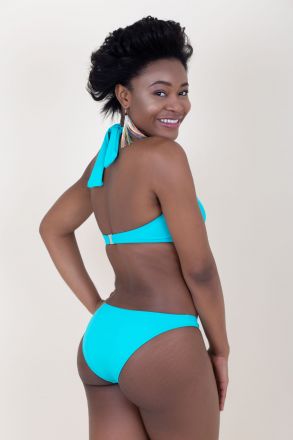 Halter neck, foam-free, wired bikini top with a removable ornamental buckle on the strap. Its special pattern and special lining make it possible to shape the body beautifully.